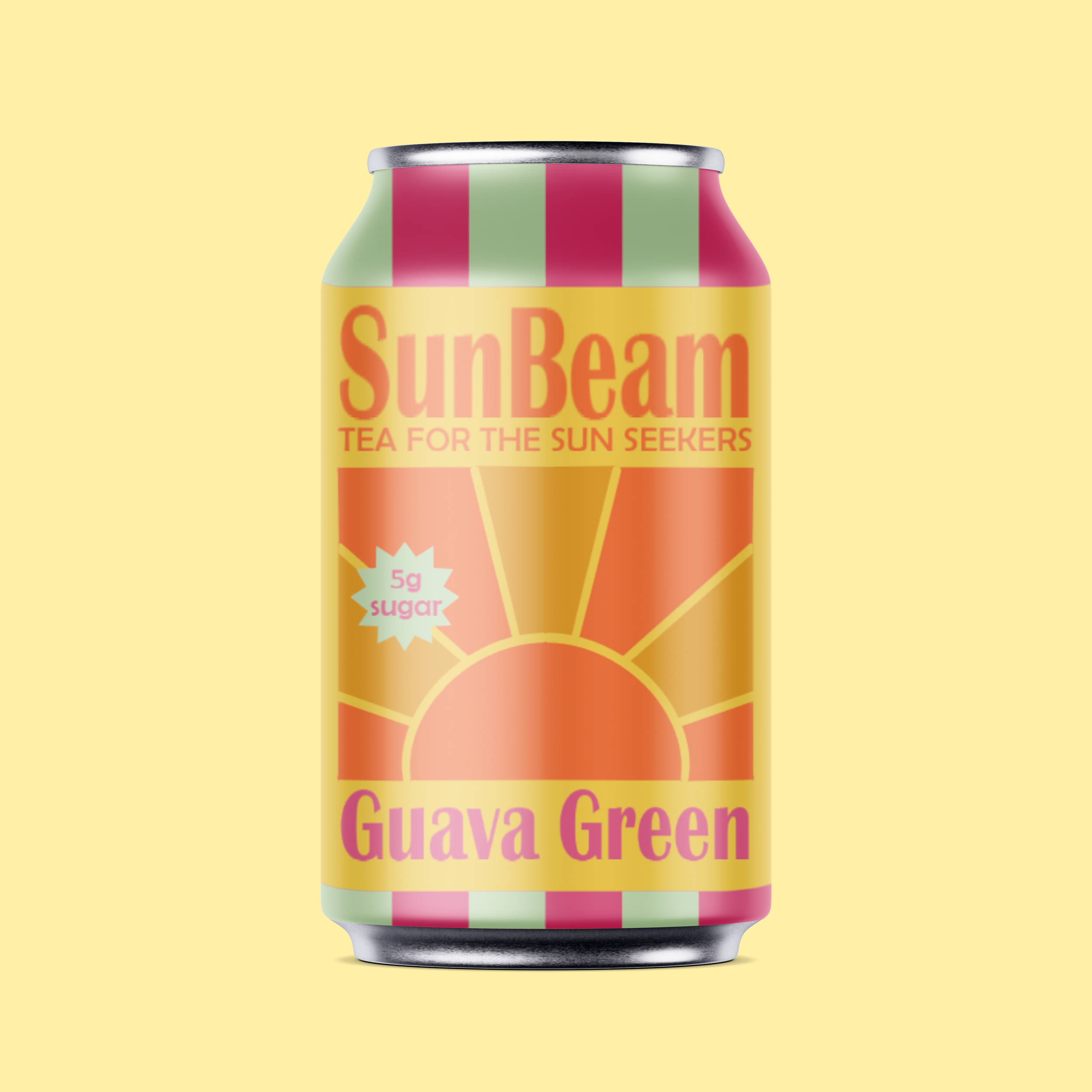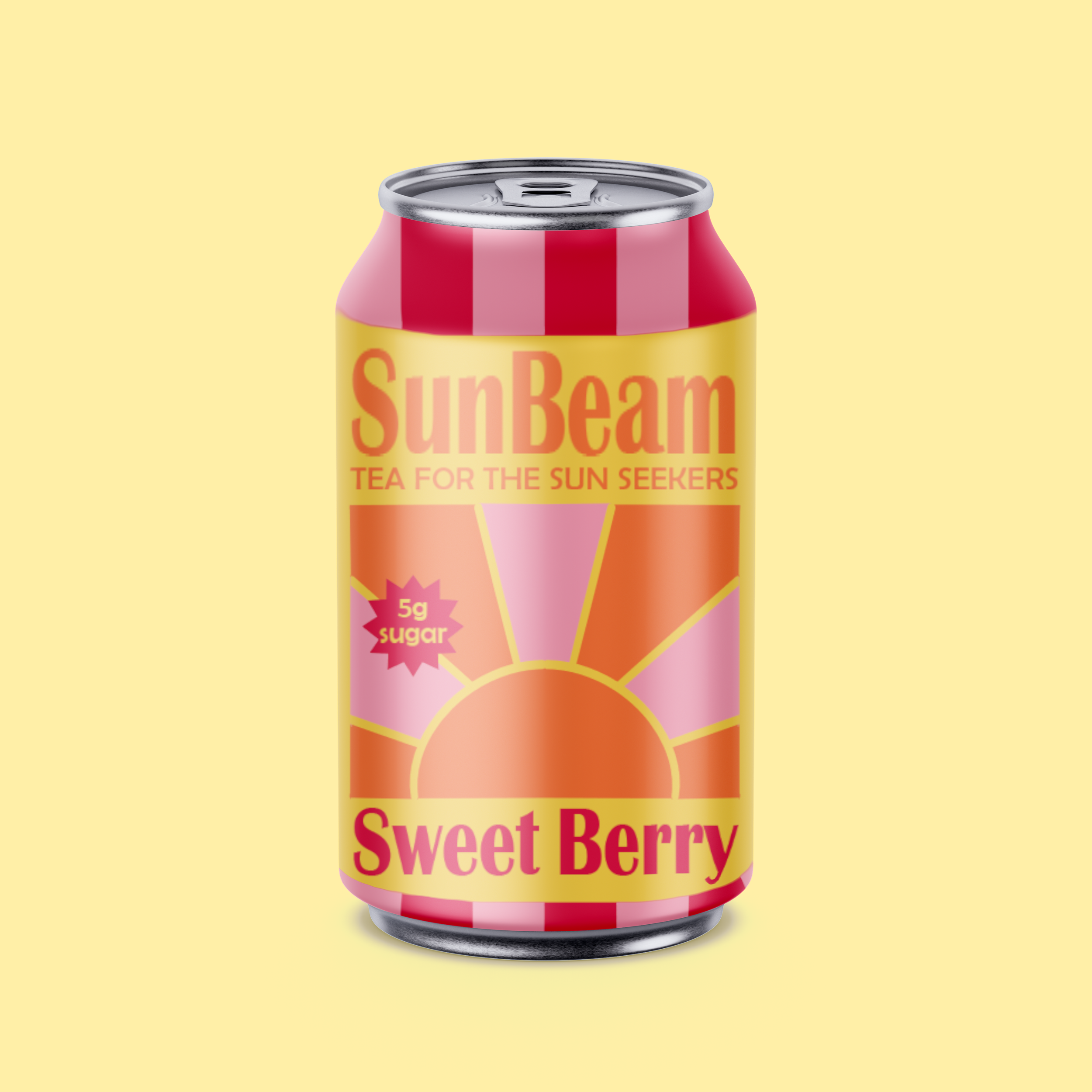 Targeting a young, active‑lifestyle audience, SunBeam pairs bright colors, retro patterns, and tropical flavors with low sugar and the natural benefits of tea to communicate easygoing fun and on‑the‑go refreshment between outdoor activities.